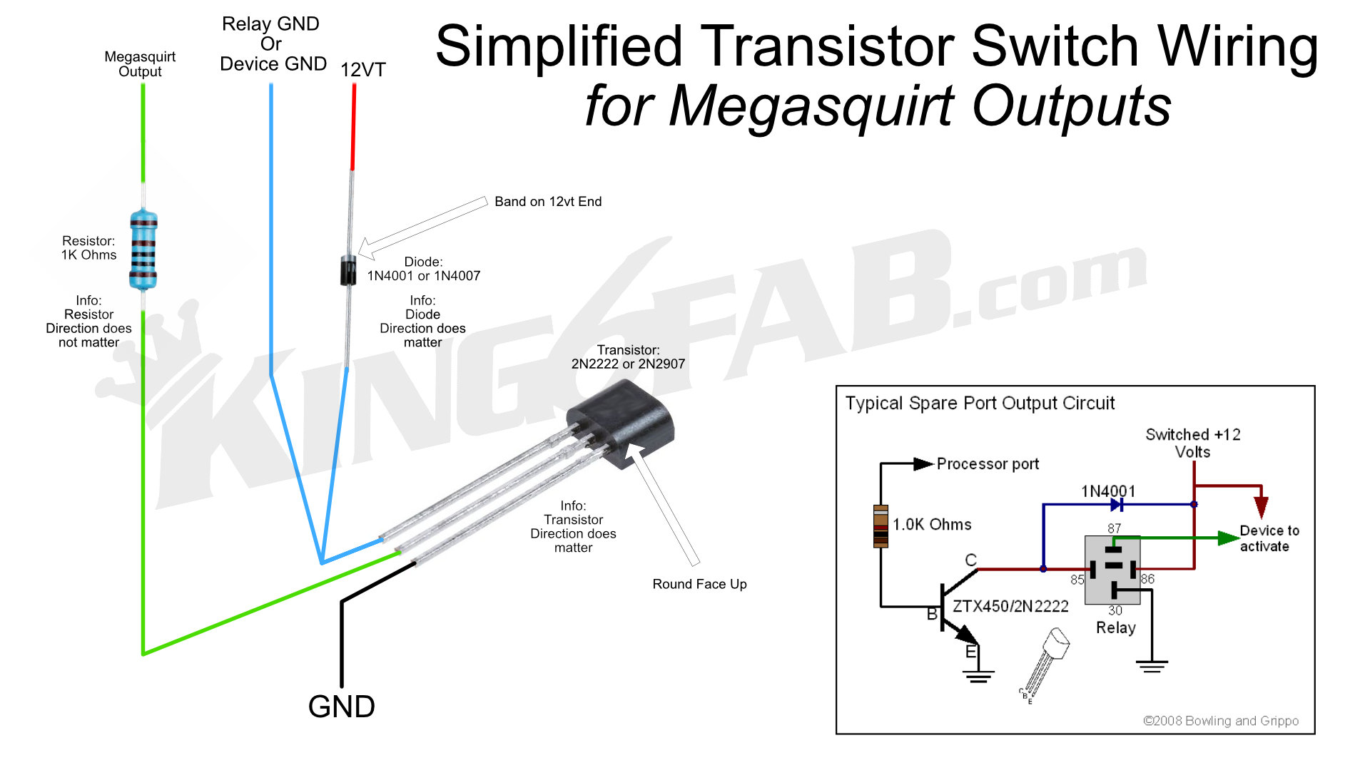 This is a simplified wiring pictorial for wiring a transistor as a low voltage on & off switch to control 12 volt electrical. Such as using digital outputs of a Megasquirt unit to control a 12 volt relay, light or device.