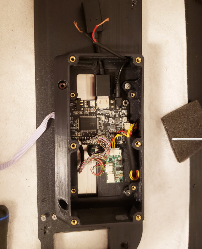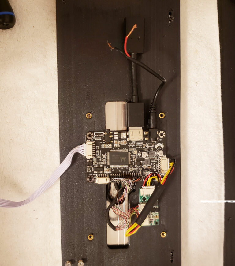 Step 2. Place the HDMI Cable Extender, Screen Push Button keyboard and screen power cable into position before mounting the electronic box to the base plate.
