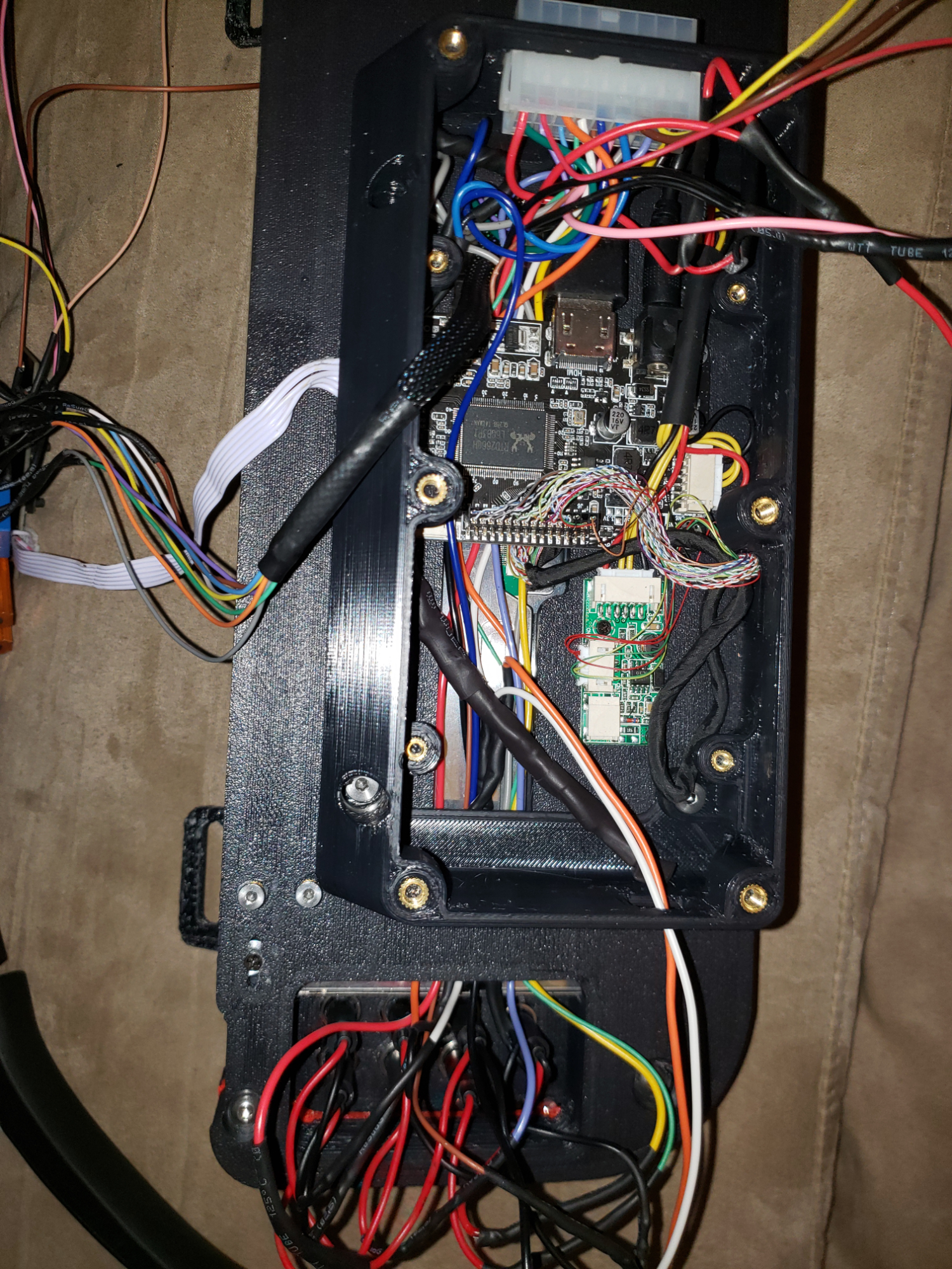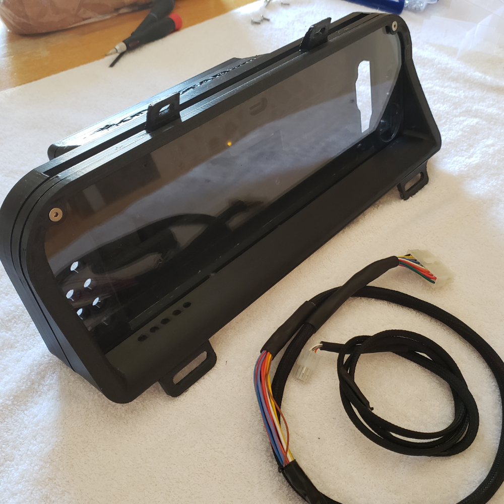 Step 1. Attach the inner bezel to the outer bezel by securing it thru the screw hole locations as shown i the picture below. If you are using a screen protector it will need to be sandwiched between both bezels in the location it fits into. If you are using indicators and/or fuel gauge then the wiring will be hanging out the backside as shown in below picture.