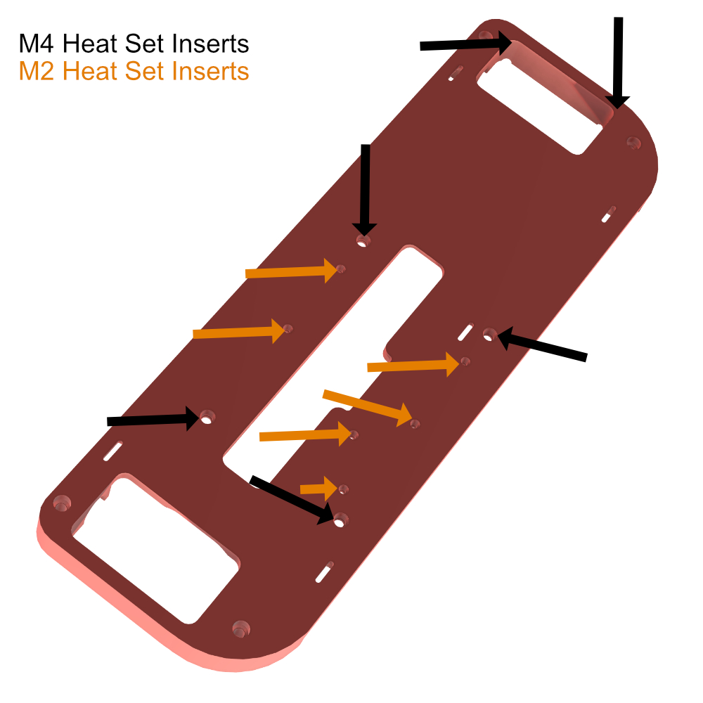 Step 1. Follow the below diagram inserting the heat set inserts designated by arrows and color type.