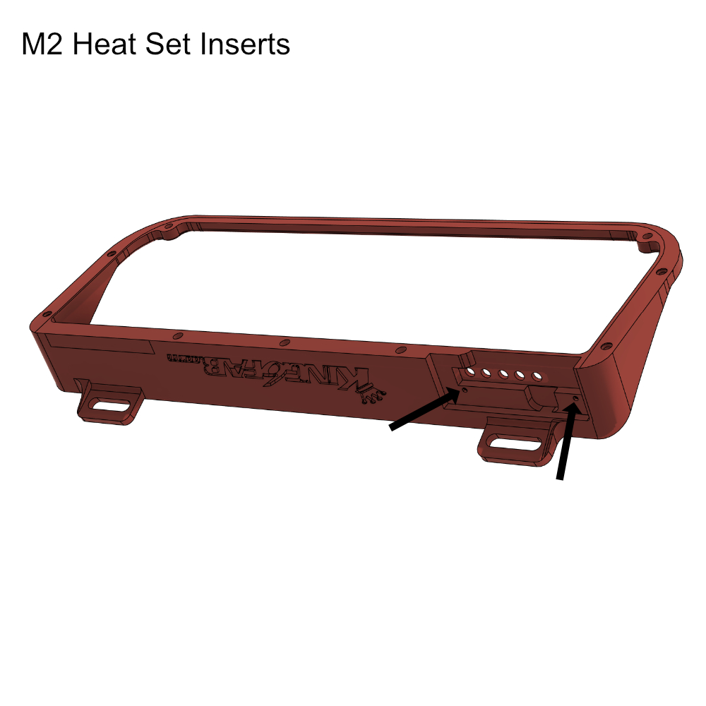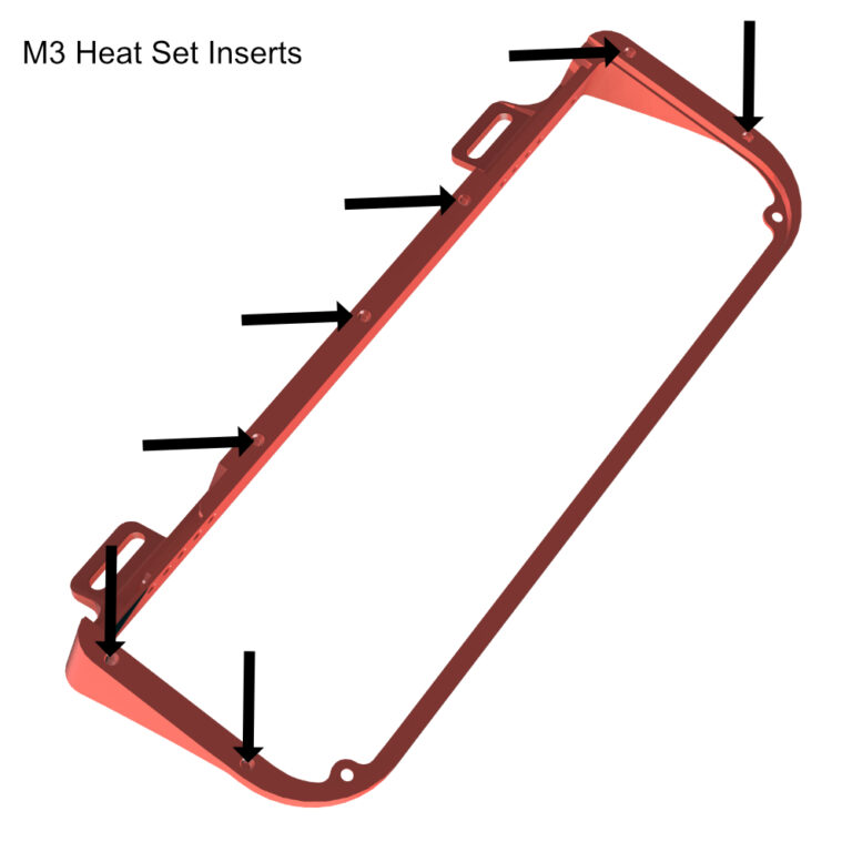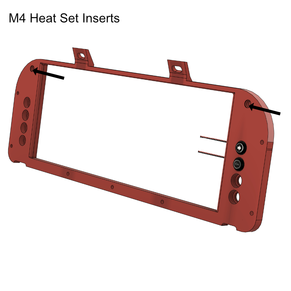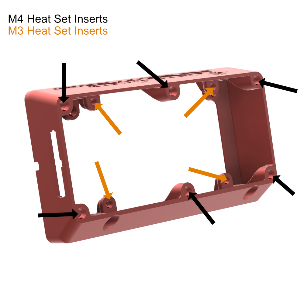 Step 1. Assemble the outer bezel with heat set inserts. You will be using M3 Inserts for this process. Use the below picture to reference where the inserts will be placed on the back side of the bezel.