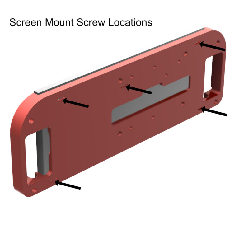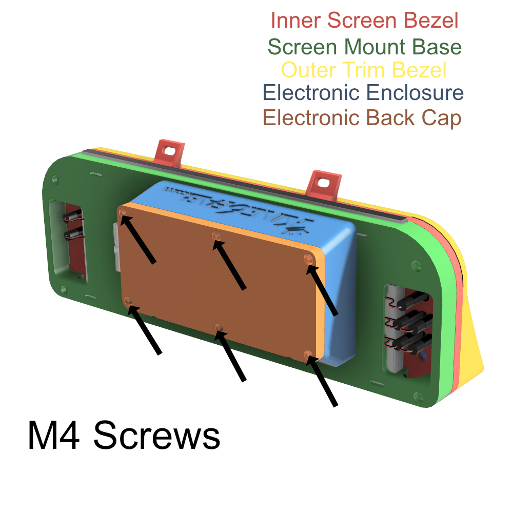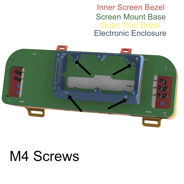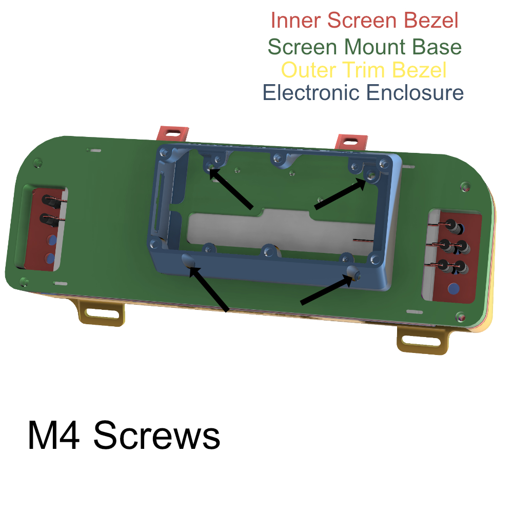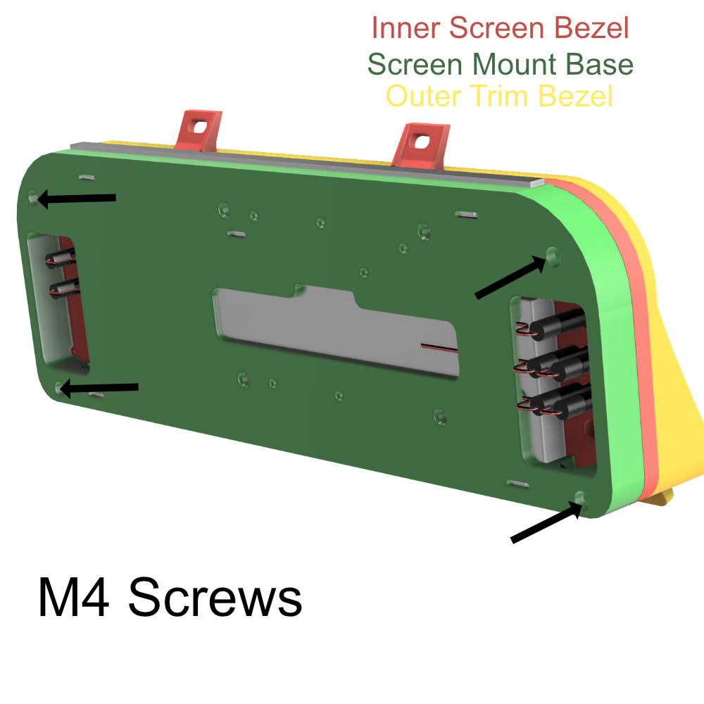 Step 1. Join the Bezel Assembly to the Screen Mount Assembly but securing them together with M4 screws in the shown locations. If you are using external indicators this is the time to start routing the pigtails behind the screen and thru to the electronic box.
