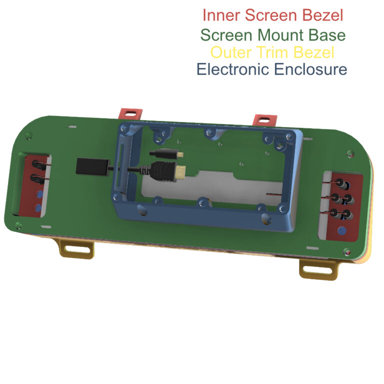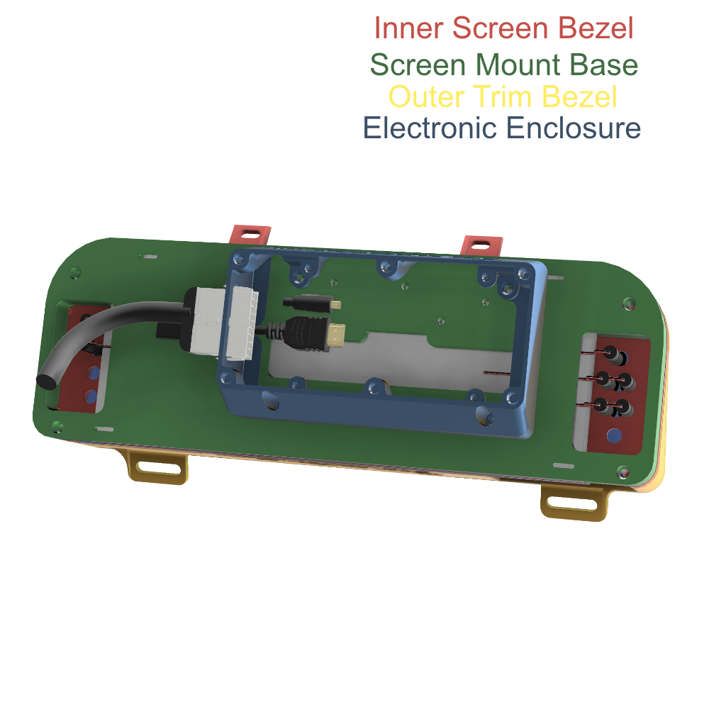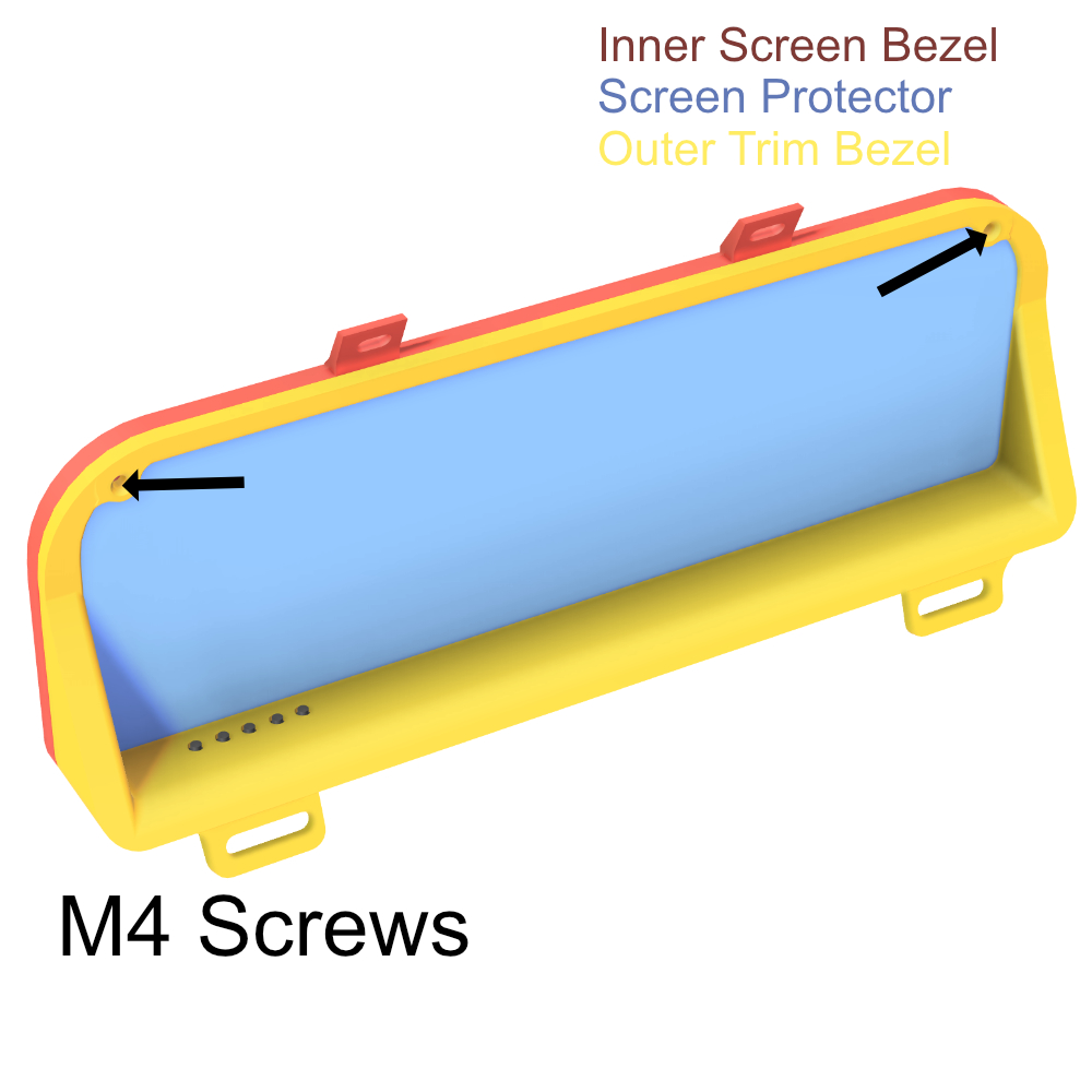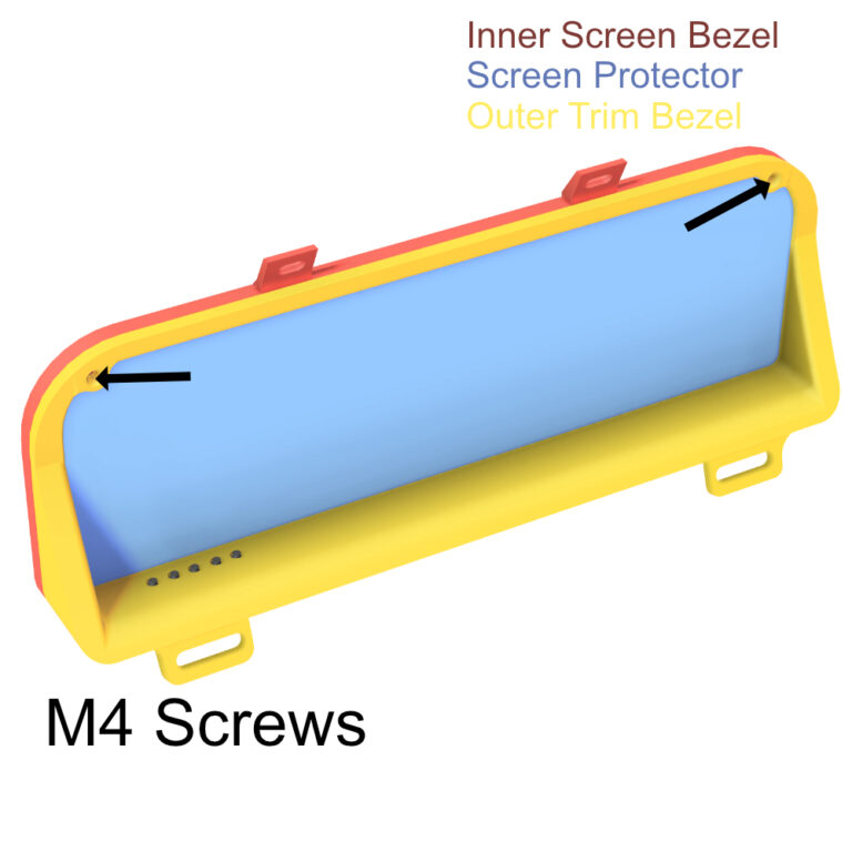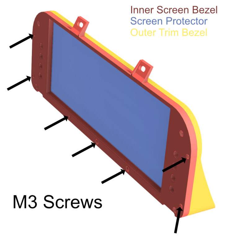 Step 1. Join the Bezel Assembly to the Screen Mount Assembly but securing them together with M4 screws in the shown locations. If you are using external indicators this is the time to start routing the pigtails behind the screen and thru to the electronic box.
