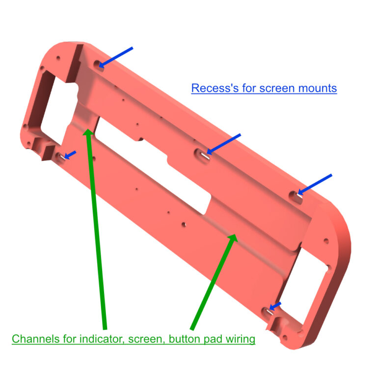 Step 1. Introduction, the base plate is designed to hold the screen in place. It features recesses on the front side for the studs of the screen to sit into. These locations are slotted to make securing the screen easier. Behind the screen is a channel and opening for screen wiring, indicator wiring options to pass thru to the back side of the base plate.