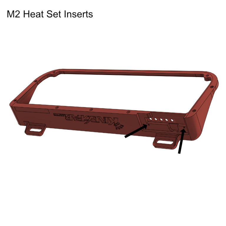 Step 2. You will be using M2 inserts for this process, push inserts into the locations identified by the arrows in the picture below. These insures will be used to hold the screen push button keypad. Additionally, this location is very tight and can be difficult to get the keypad to line up if the print quality is poor, so hot glue may be used to hold the keypad instead of M2 screws.