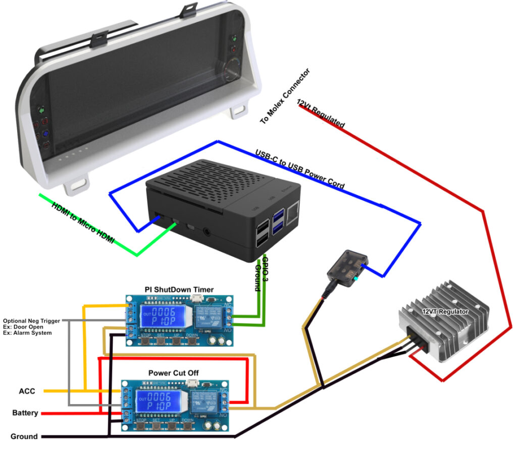 The timer can use a Neg or Pos or Both Input triggers, such as the POS can be used for the ignition when it’s turned on, The Neg can be used for the door trigger when a door is opened. Using both these inputs will allow the PI and screen to boot immediately after a door is opened, if the door remains open the system stays on. If the door is closed the timer countdown until the door is re-opened, or the key is turned on. If neither situation happens before the time runs out, the system powers down. If the key is turned on, the system stays powered on while the door is closed.